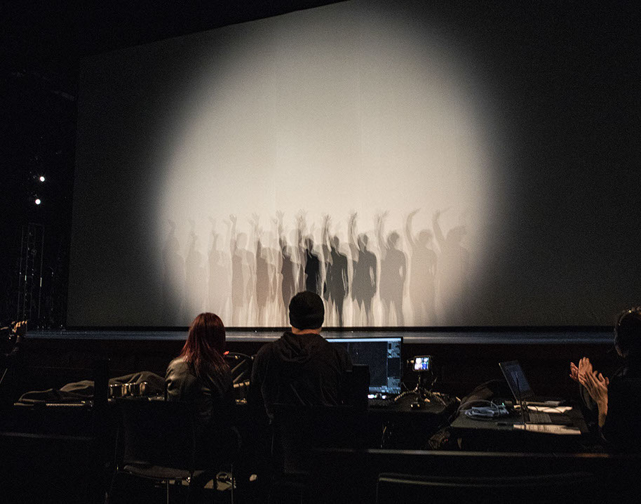 In addition to using live cameras to mediate the body, we were interested in exploring earlier technological methods of mediating bodies, such as shadows. We collaborated with our lighting designer to use theatrical lights to create shadows of the dancers. This low-tech form of mediating the body also played into our themes of presence/absence in a more ancient and ritualistic way that allowed us to tap into a more earthy and existential exploration of presence.
