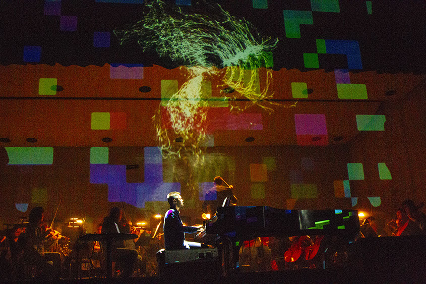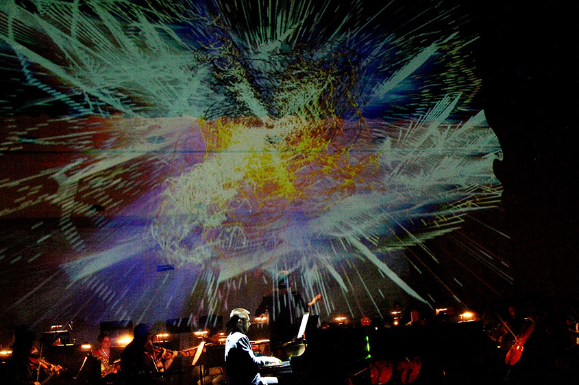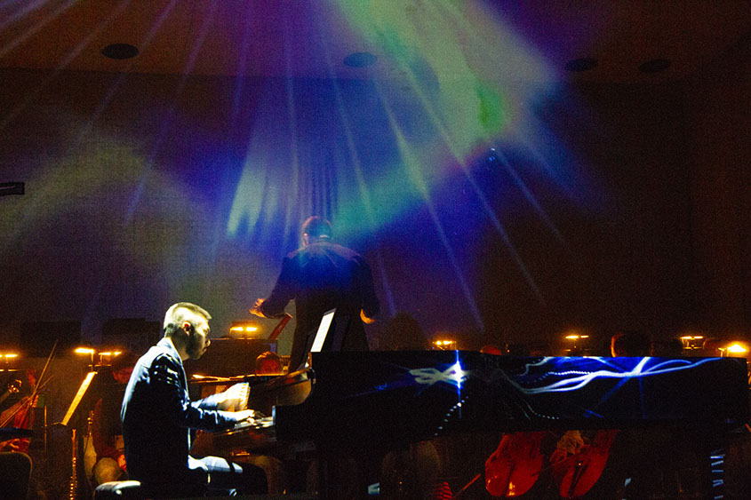 I wanted the artwork to feel organic, grow over time and be in conversation with the music and musicians. The creative team was looking for the musicians to be immersed in the visuals. Given the limitations on space, time and equipment, I suggested that the orchestra be placed behind a scrim, with Conrad on piano downstage of the scrim. This would make it feel like the animations were floating in space between the orchestra and Conrad. I projection mapped the front of the piano and used another projector to map the keys and double as a spot light for Conrad.