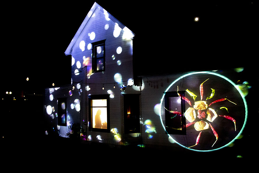 Themes that we explored in this piece were informed by our shared experiences during the pandemic. Sheltering at home for six months, the piece contemplated cycles of change, repetition, creation, destruction, loss and regeneration. As a lot of my work does, Impermanence examined the relationship between live, embodied performance of a human working in partnership with physical objects and advanced technology. Using the mandala as a basis for the main art creation – this 20 minute performance might be viewed as form of process art. During the course of the performance Dana Keeton, the co-creator and performer moved through three cycles of creating and deconstructing a mandala. The audience saw various mediated representations of her body. She was standing inside a window of a house. Lit from behind, her silhouette appeared on a white covering in the window. Simultaneously, a top-down camera captured her hands building and deconstructing the mandala. These various views of the mediated body and different POV of the movement/performance offer both a different view into the performative world and what it means to be and view a live embodied performance with simultaneous views of the meditated body.