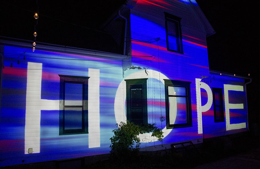 In addition to the nightly performance, we were asked to activate the building for the duration of the evening – roughly 1.5 hours before our performance began. We created a looping video that repeated for 1.5 hours and also post-show. Given the performance was in an election year right during the pandemic, right before the national election and that the politics and mores of our country were at such a dividing point, we wanted to create a message that spoke to a few things. First and foremost: a reminder to all American citizens viewing the artwork who were of legal, voting age to fulfil their most sacred duties as a citizen – the right to vote. Given such a divided spectrum of views, we also wanted to remind people that an act of voting should be of hope and also one of love. The background colors of red, white and blue were meant to be patriotic, while the purple was meant to invoke unity.