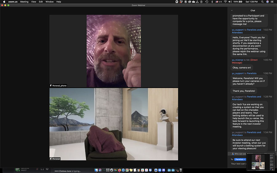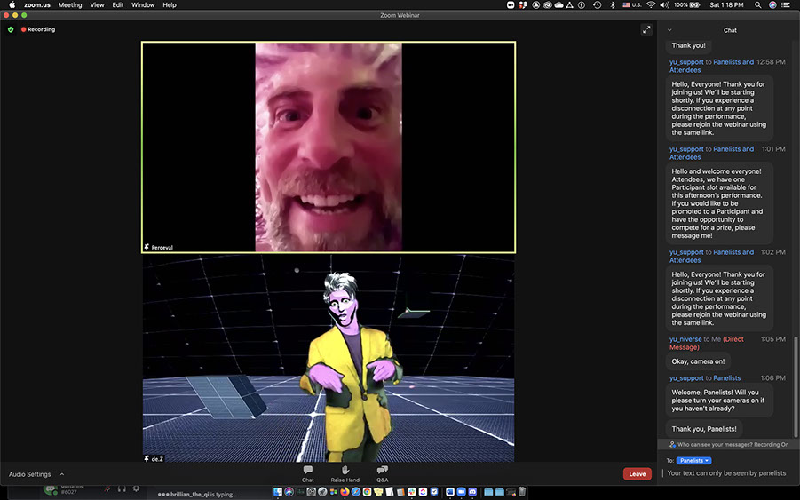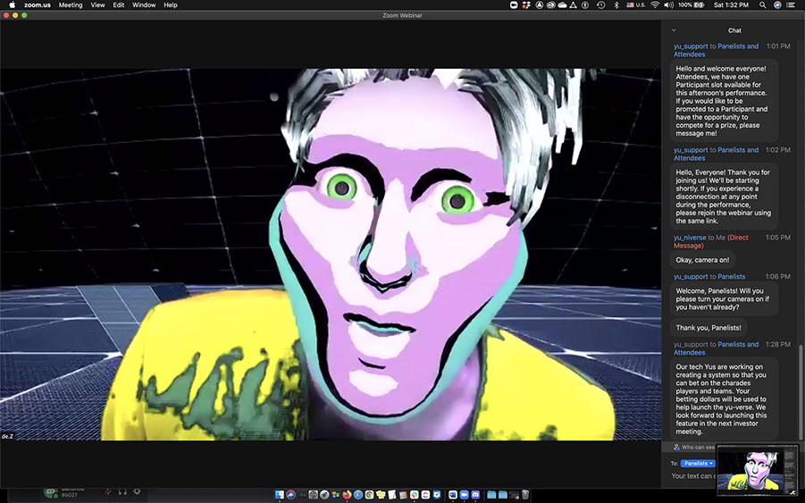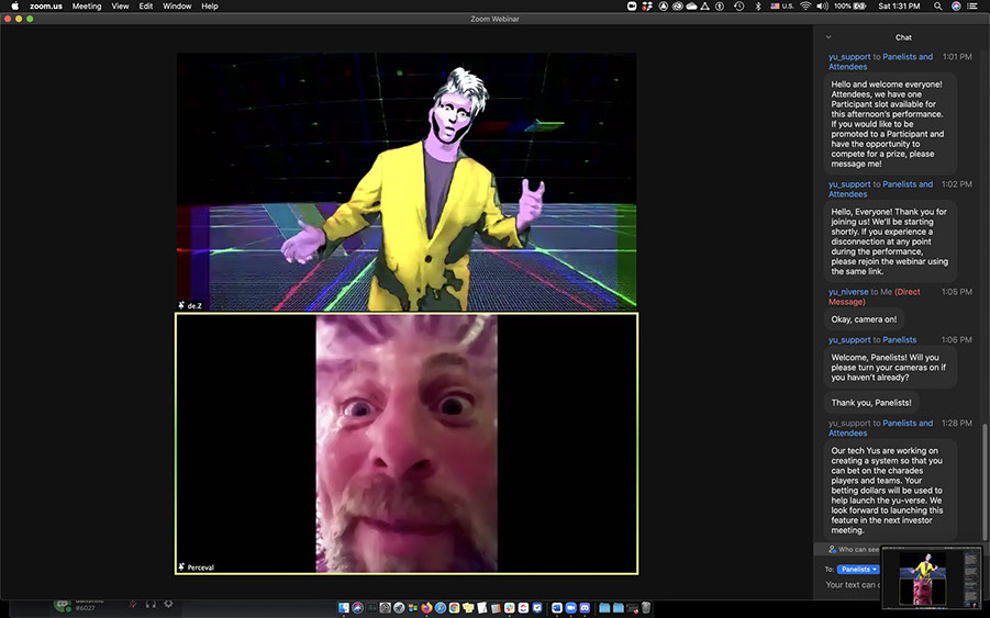 de.Z playing charades with audience members in Zoom. June 2021 virtual/online workshop performance.