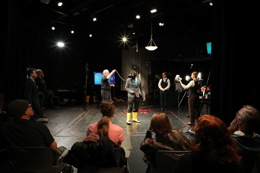 A multi-year research project of faculty and students at the University of Iowa departments of Theatre Arts, Dance, Computer Science, Art & Art History, and Engineering that explores the emerging collision of live performance, 3D design, computer science, expanded cinema, immersive environments, and virtual worlds by creating live performances in shared virtual and physical worlds. This research develops new ways to create immersive theatrical experiences in which multiple, co-physically present and remotely-located audience members engage with live actors through 3D video streams in virtual and hybrid physical/digital environments. To achieve this, the team devises original creative experiences, develops robust, real-time depth compression algorithms and advanced methods to integrate live 3D video and audio streams into spatially distributed, consumer VR systems.