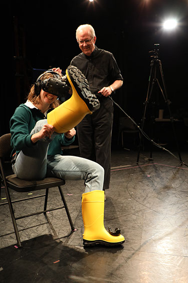 User puts on trackable boots (via a Vive puck) at OSU Performance of Elevator #7. User sees digital boots in the headset.
