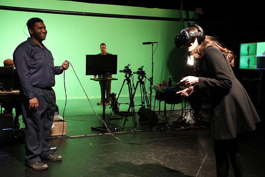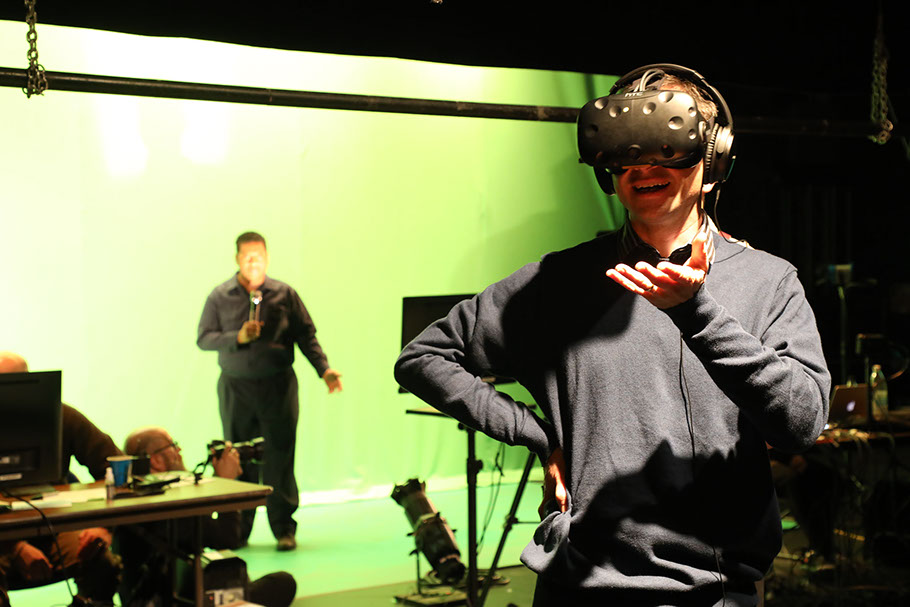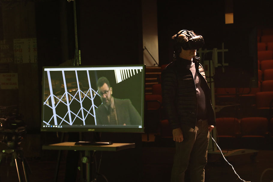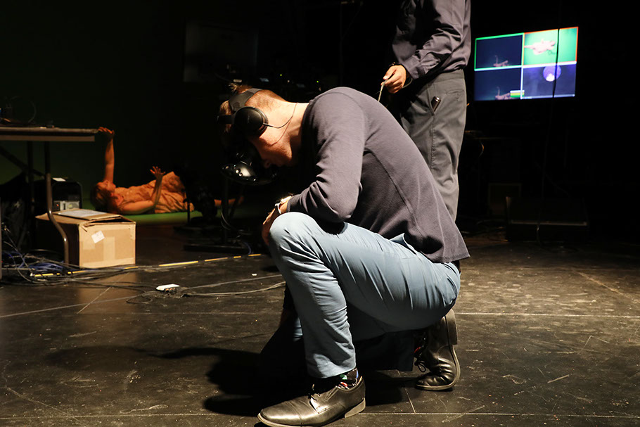 Composite of the actors viewed by the player (in physical form L) and a display showing the actor in VR (right).