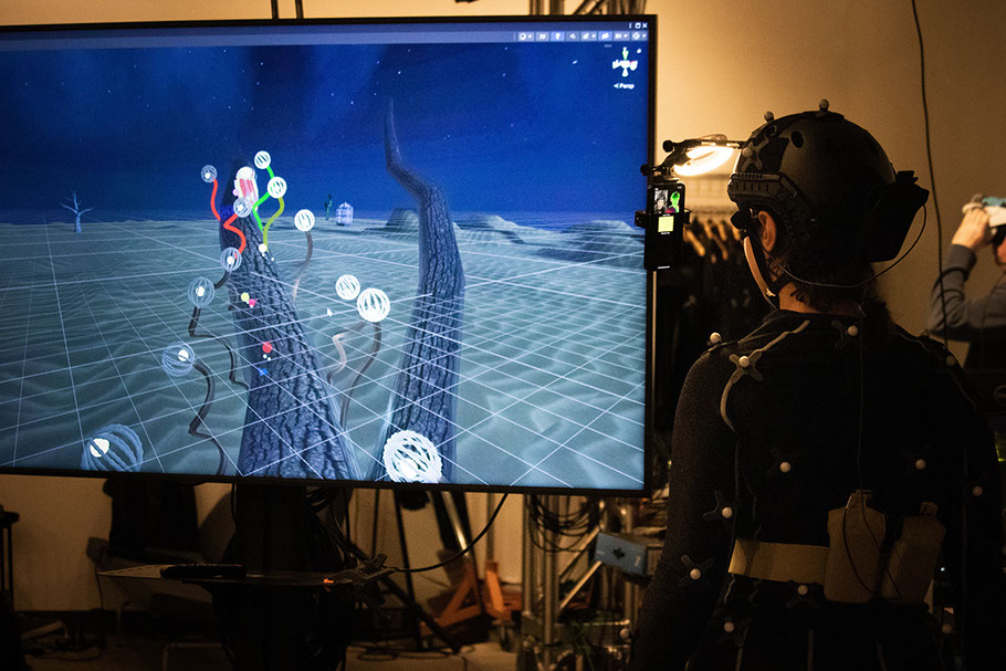 Performer in mocap suit with facial capture (iPhone mount).