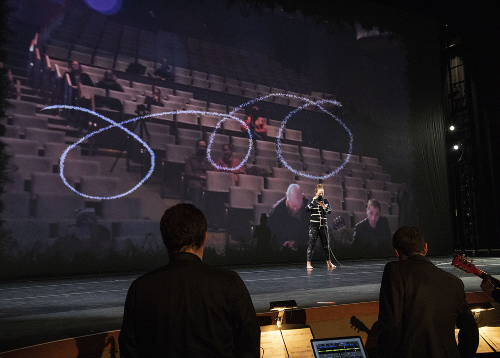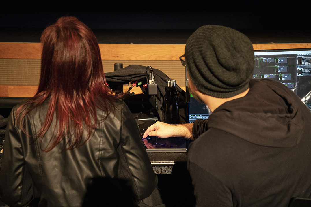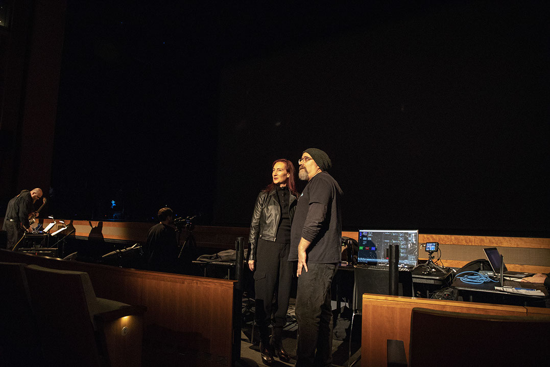 We activated the entire space and allowed most manipulations to be visible to the audience. The musicians, the student assistant designers, JK and myself all entered from the audience. This connected us with the audience, while also activating it as a performance space and foreshadowing the ending where we would turn the camera and gaze to the audience itself by putting the camera on the audience and allowing them to see themselves. The musicians stood in the orchestra pit while JK and myself were in a VJ station along with student assistants on the other side of the orchestra pit. Having us in view both physically and at times mediated via a camera projected onscreen exposed elements of how we were creating the piece in real-time. The performance wasn’t just contained to the stage or even the venue– at the end we zoomed out from the physical stage and performance venue to the outer reaches of space. This final fly out situated us as humans and our place and scale within the universe. This was achieved with a live camera attached to a fly-rail that on cue was flown out (up) and then cut to a similar fly-out of Google Earth and then into Space. This flyout, from the venue on, was the only pre-recorded video in the entire piece.