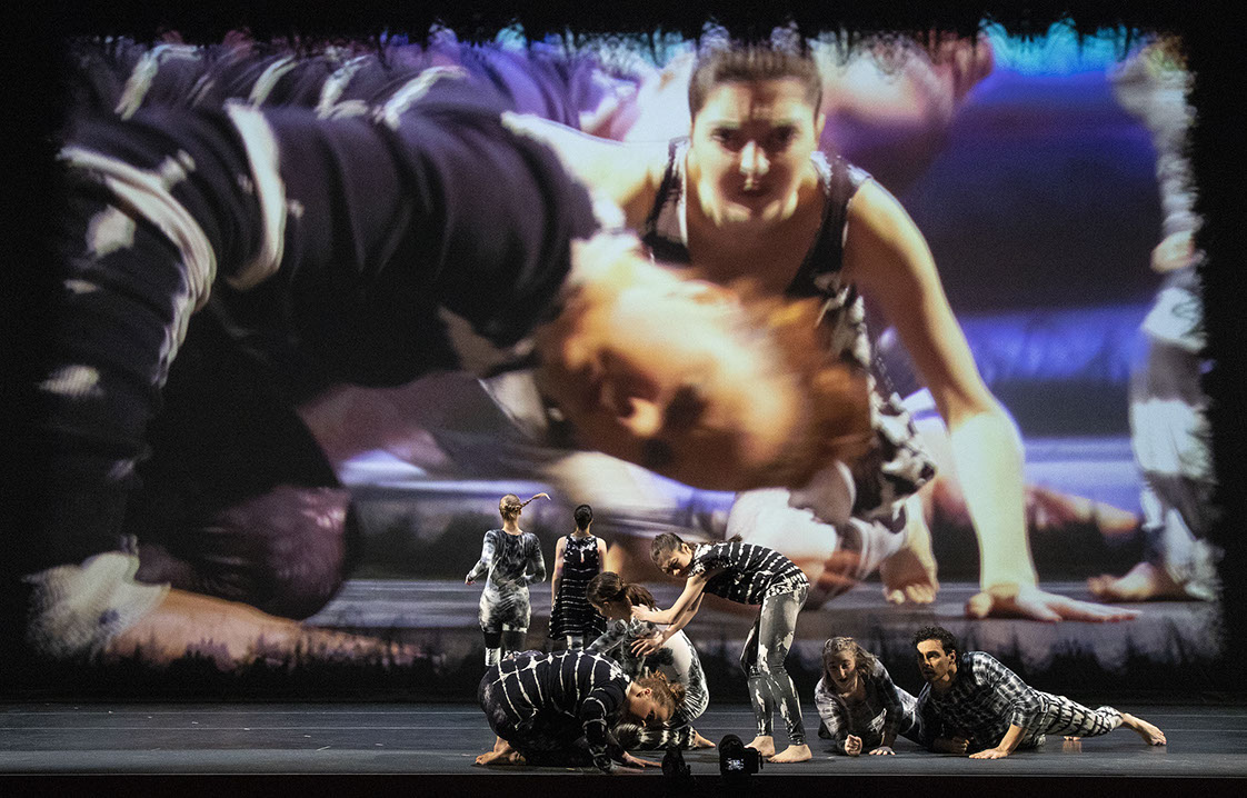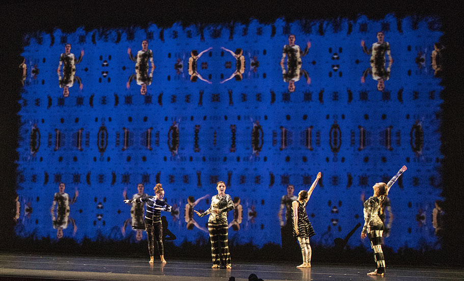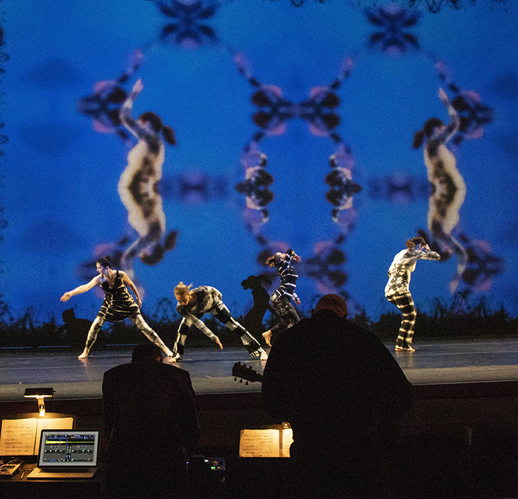 The dancers' bodies become a kaleidoscope. The musicians in the foreground.