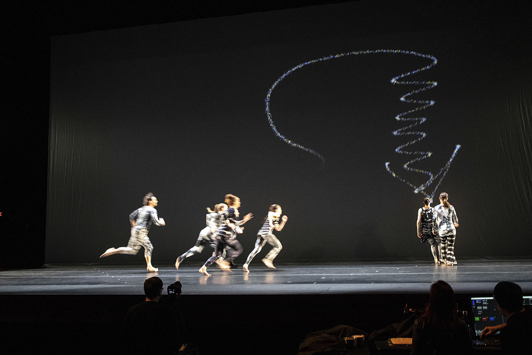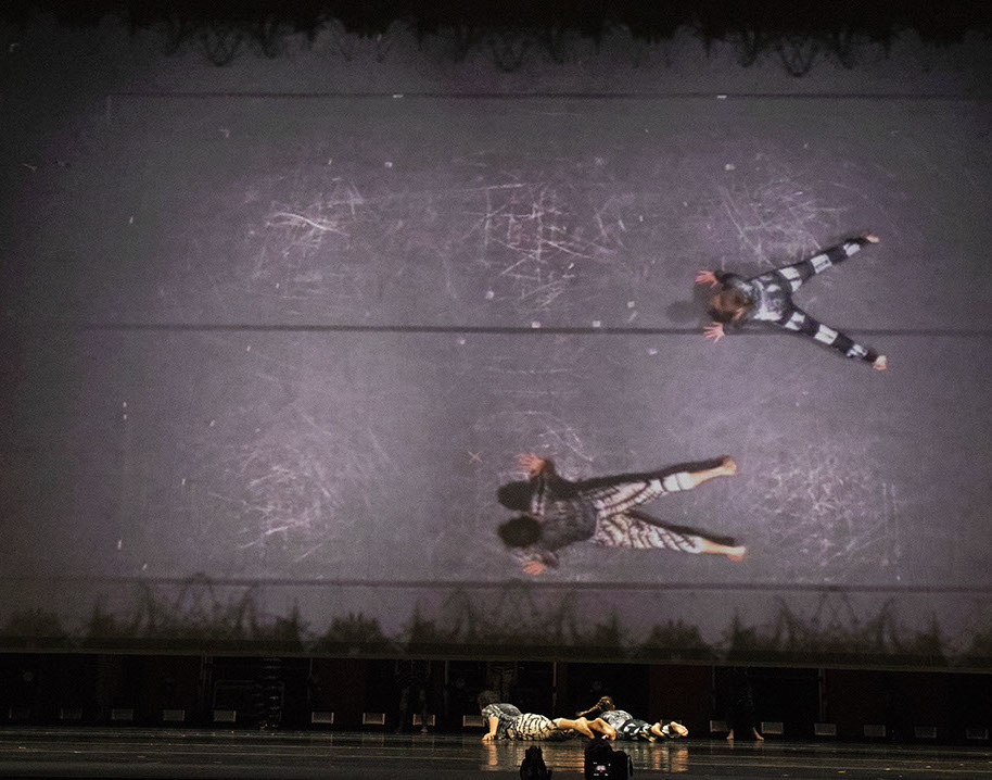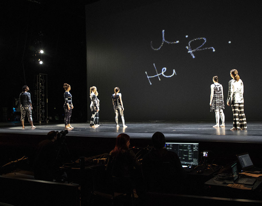 Drawing on an iPad, which is connected to the media system and projected in real-time. The dance makers call the dancers.