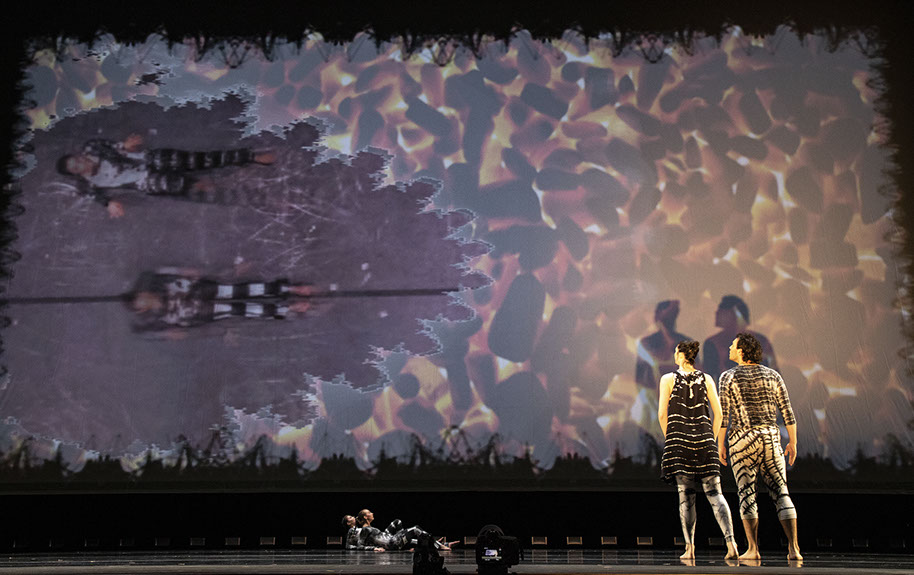 The dancers discover a live camera that projects mediated versions of themselves on a slight delay.