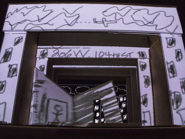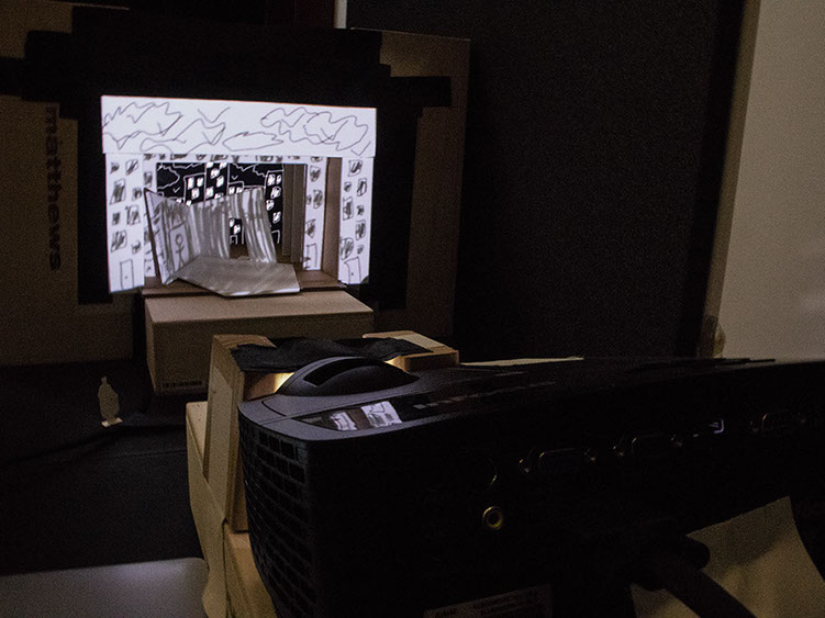 Projection mapping project using After Effects for content creation and QLab for mapping. One projector hooked up to a laptop, projecting onto a print hanging on the wall.