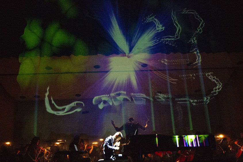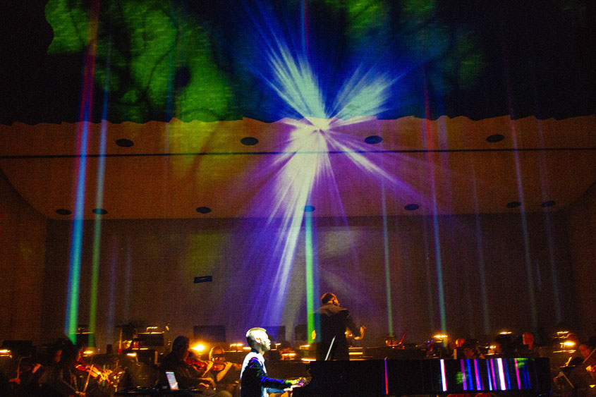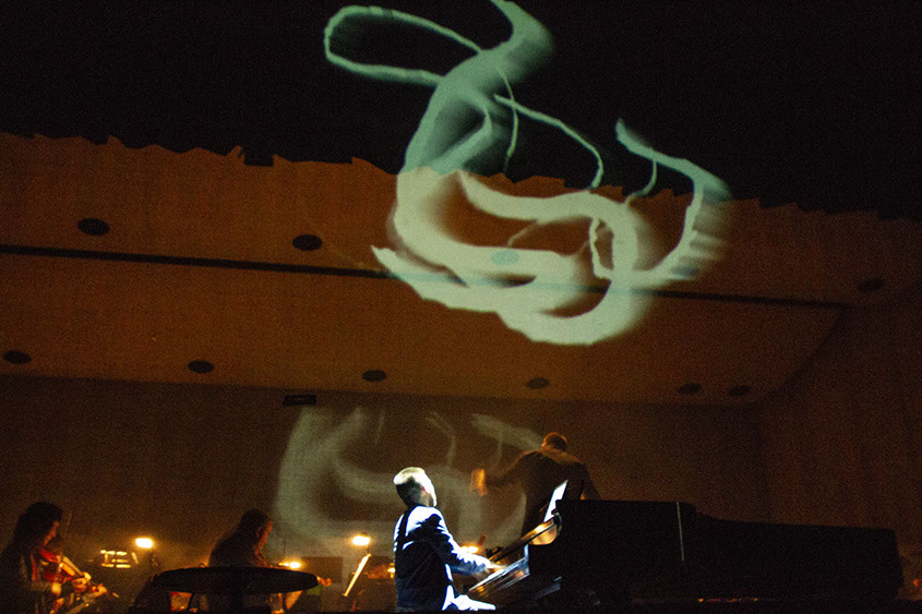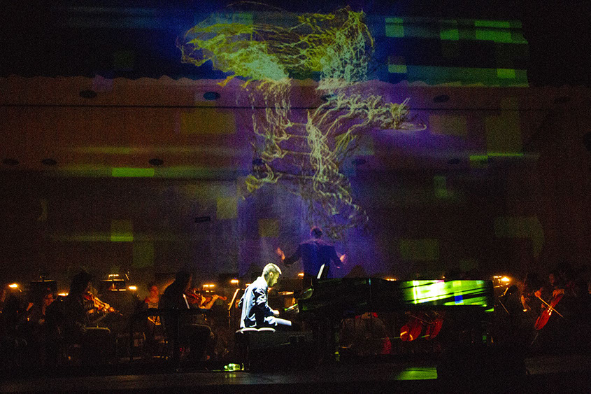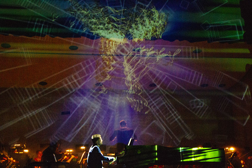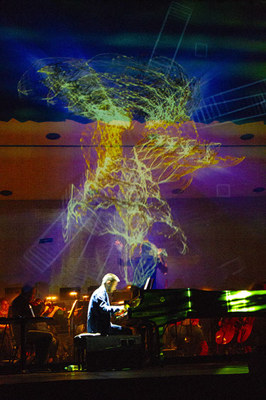 I wanted the artwork to feel organic, grow over time and be in conversation with the music and musicians. The creative team was looking for the musicians to be immersed in the visuals. Given the limitations on space, time and equipment, I suggested that the orchestra be placed behind a scrim, with Conrad on piano downstage of the scrim. This would make it feel like the animations were floating in space between the orchestra and Conrad. I projection mapped the front of the piano and used another projector to map the keys and double as a spot light for Conrad.