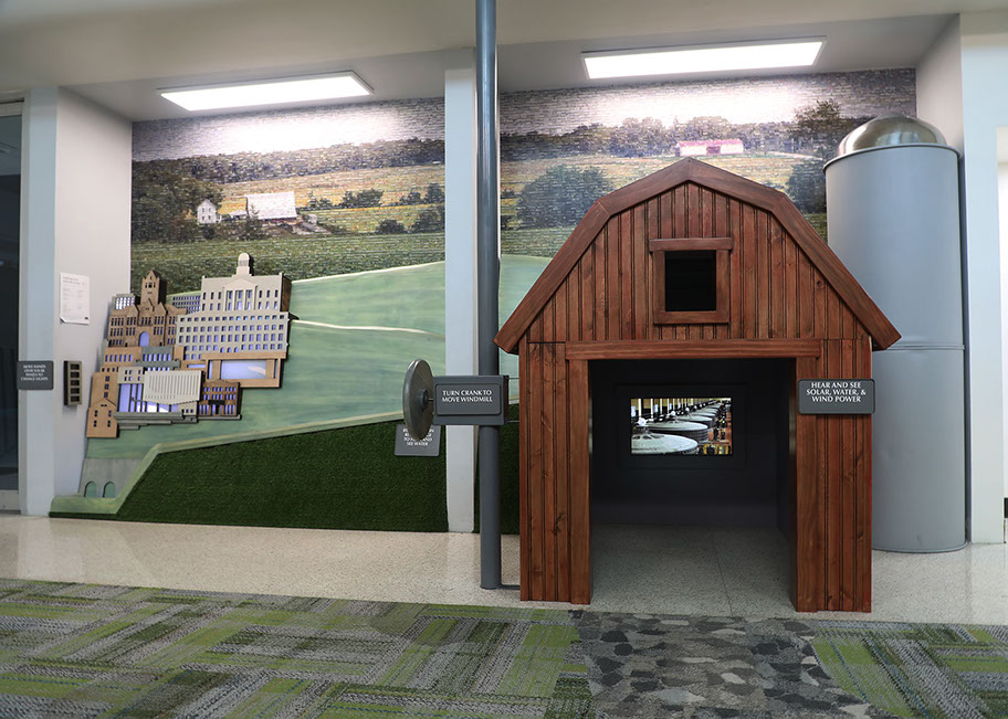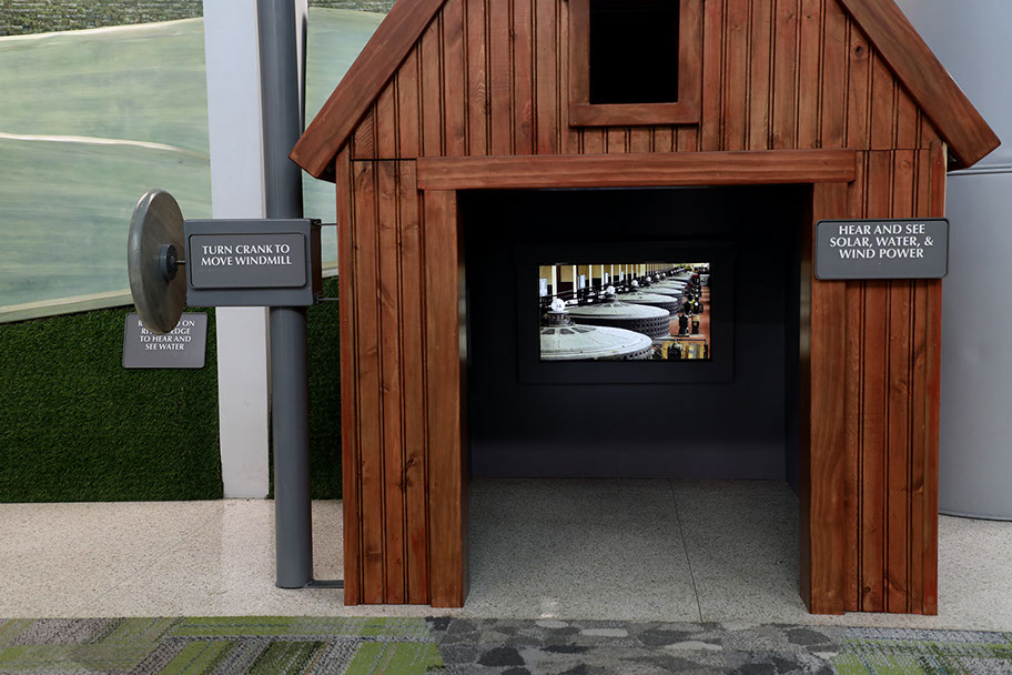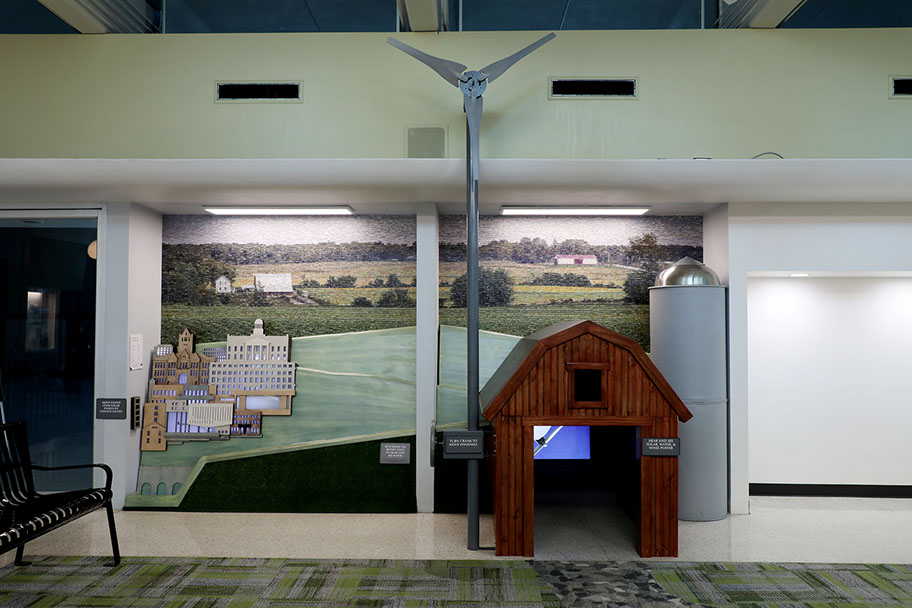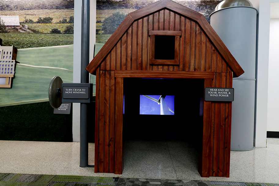 Inside the barn, where children watch videos playing on three screens - one per wall. A wind turbine generates electricity in northern Iowa.
