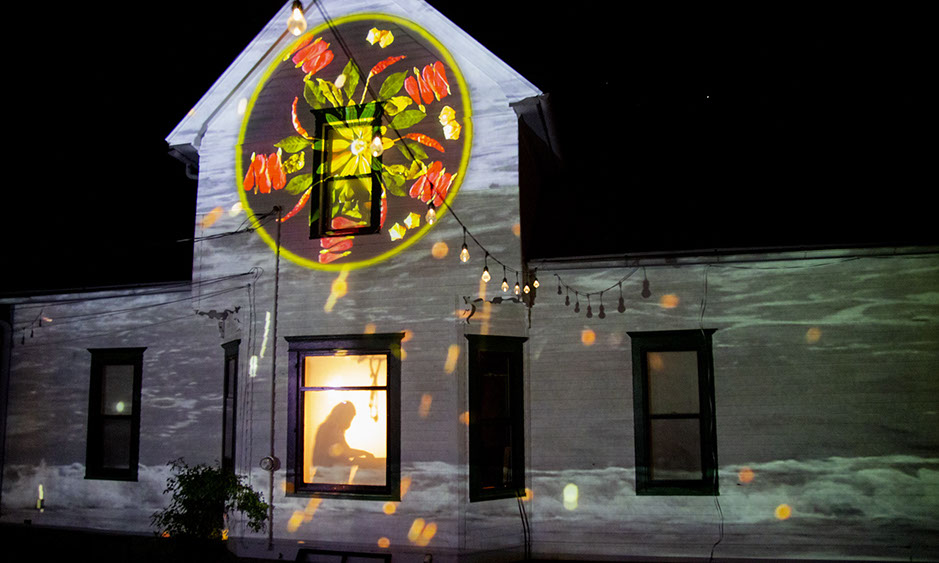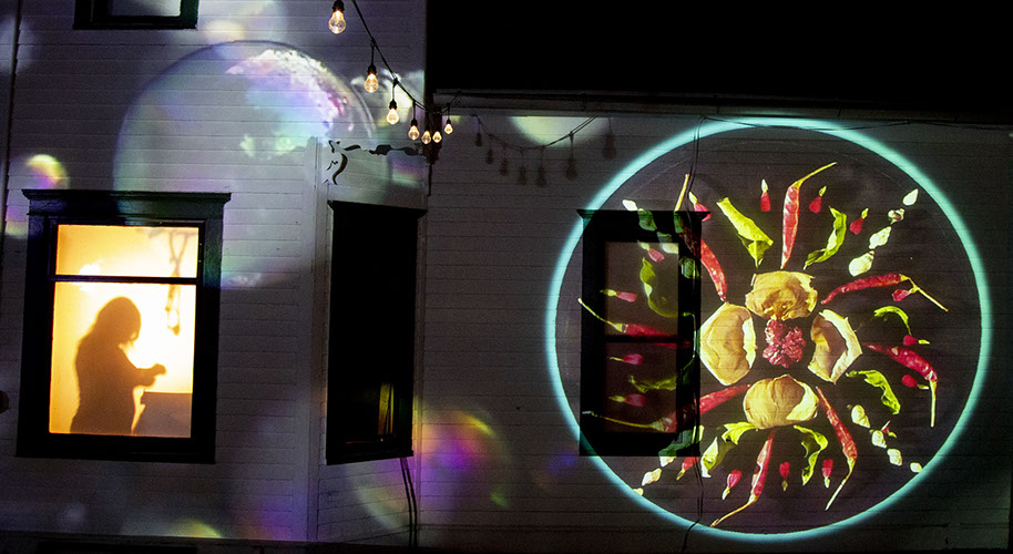 Themes that we explored in this piece were informed by our shared experiences during the pandemic. Sheltering at home for six months, the piece contemplated cycles of change, repetition, creation, destruction, loss and regeneration. As a lot of my work does, Impermanence examined the relationship between live, embodied performance of a human working in partnership with physical objects and advanced technology. Using the mandala as a basis for the main art creation – this 20 minute performance might be viewed as form of process art. During the course of the performance Dana Keeton, the co-creator and performer moved through three cycles of creating and deconstructing a mandala. The audience saw various mediated representations of her body. She was standing inside a window of a house. Lit from behind, her silhouette appeared on a white covering in the window. Simultaneously, a top-down camera captured her hands building and deconstructing the mandala. These various views of the mediated body and different POV of the movement/performance offer both a different view into the performative world and what it means to be and view a live embodied performance with simultaneous views of the meditated body.