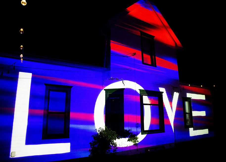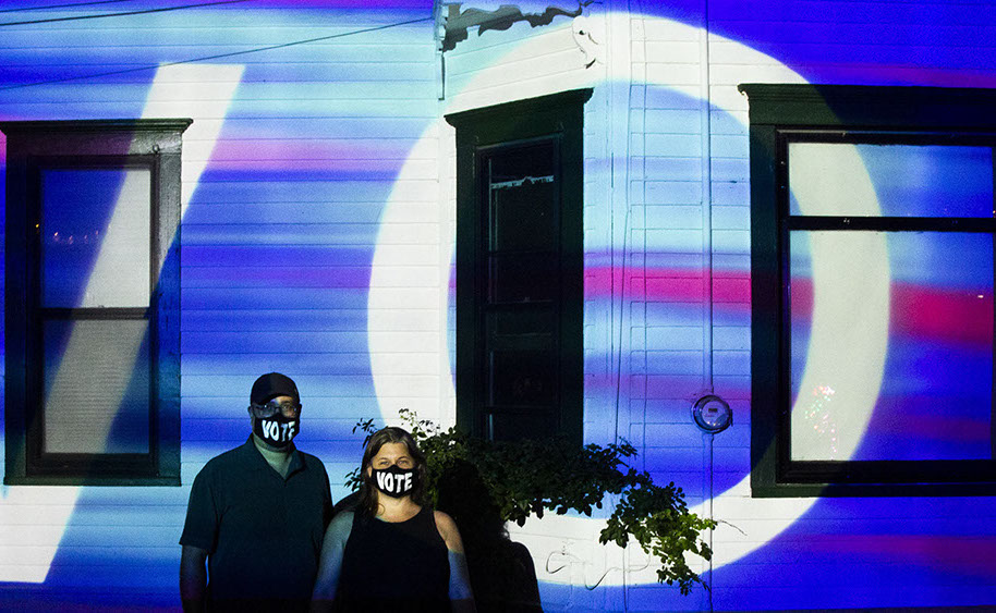 In addition to the nightly performance, we were asked to activate the building for the duration of the evening – roughly 1.5 hours before our performance began. We created a looping video that repeated for 1.5 hours and also post-show. Given the performance was in an election year right during the pandemic, right before the national election and that the politics and mores of our country were at such a dividing point, we wanted to create a message that spoke to a few things. First and foremost: a reminder to all American citizens viewing the artwork who were of legal, voting age to fulfil their most sacred duties as a citizen – the right to vote. Given such a divided spectrum of views, we also wanted to remind people that an act of voting should be of hope and also one of love. The background colors of red, white and blue were meant to be patriotic, while the purple was meant to invoke unity.
