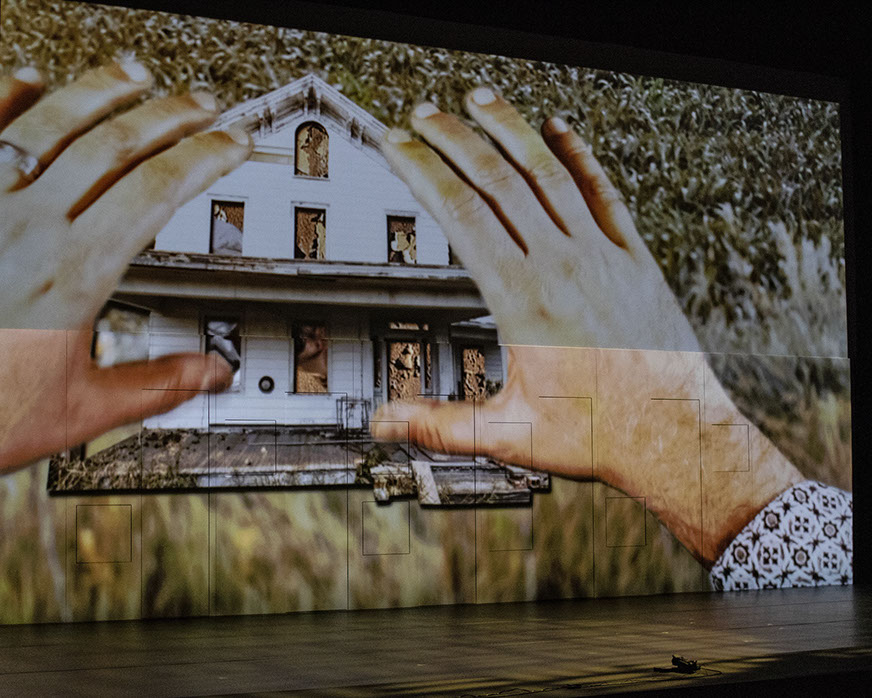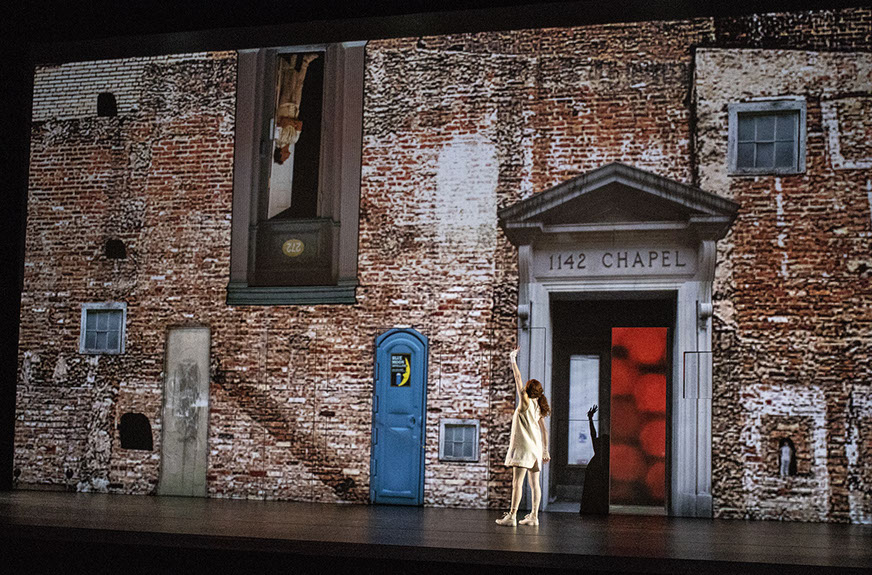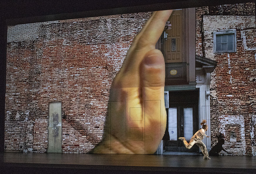 We were very interested in the screen serving as a portal to and from projected/mediated worlds to the live physical world onstage. I served as co-scenic designer to create a custom projection wall that had doors and windows that the dancers would be able to enter and exit into and out of the screen. The top two-thirds of the screen was a front projection screen. We had a rear projection screen behind the front wall so that when the dancers opened the doors and windows there would be a world within (or beyond).