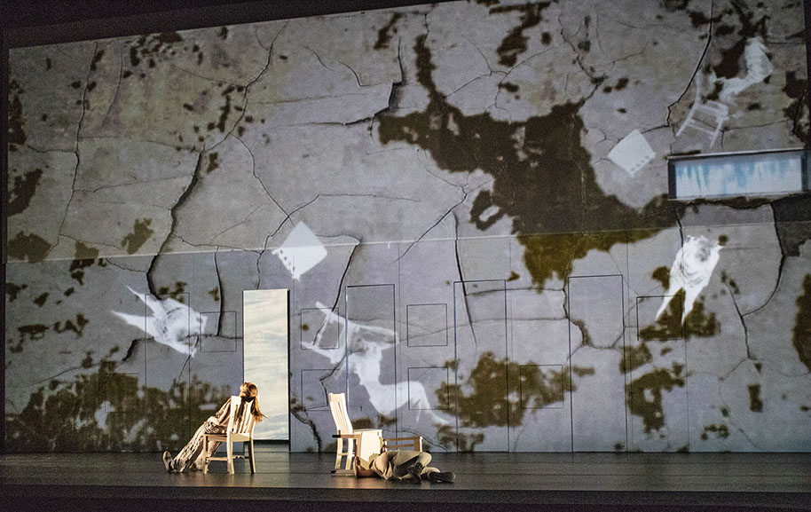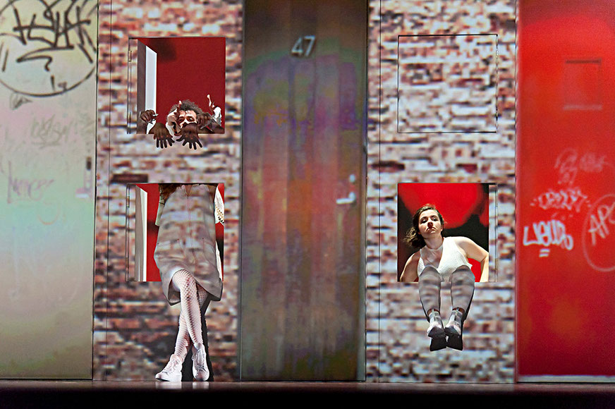 Dancers open windows in the screen. Rear projection screen is seen behind them through the open windows.