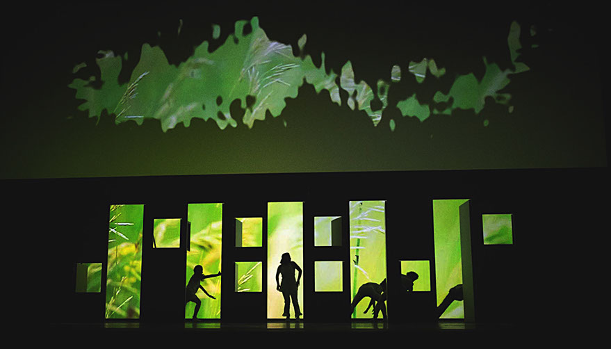 The video workflow required that a good deal of the choreography had to be created and learned early in the rehearsal process. We created a score, created movement, rehearsed and then recorded sections of the choreography in a greenscreen studio. These videos were edited, and filters applied. Then they were mapped to the screen and cues created, so that the live dancers could then rehearse again with the prerecorded elements.