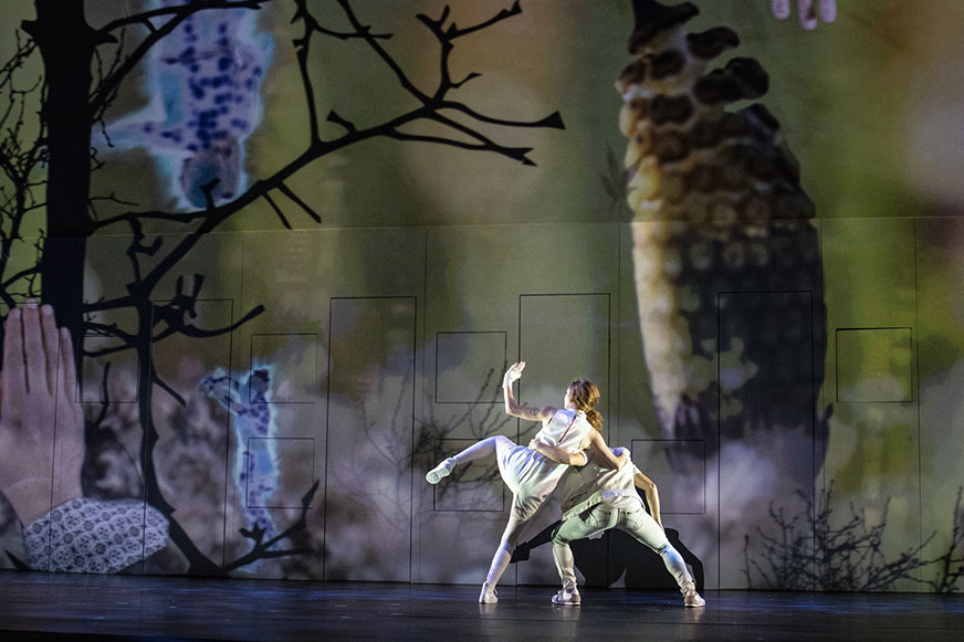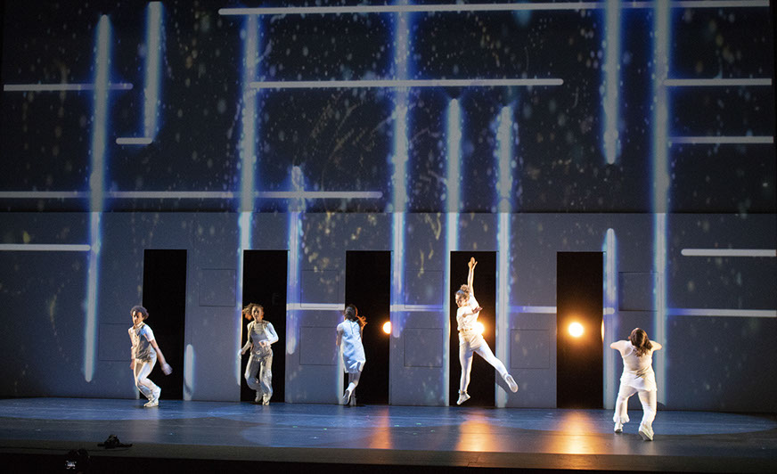 As we were nearing a national election for President, in a very divisive America, our discussions began around the theme of opposites. We were interested in showing two sides of the same idea. This is how the idea for the set - a giant projection wall dividing the stage - was born. After the election, we abandoned this theme and instead focused on newly emerging themes, that would keep the piece light and fun.