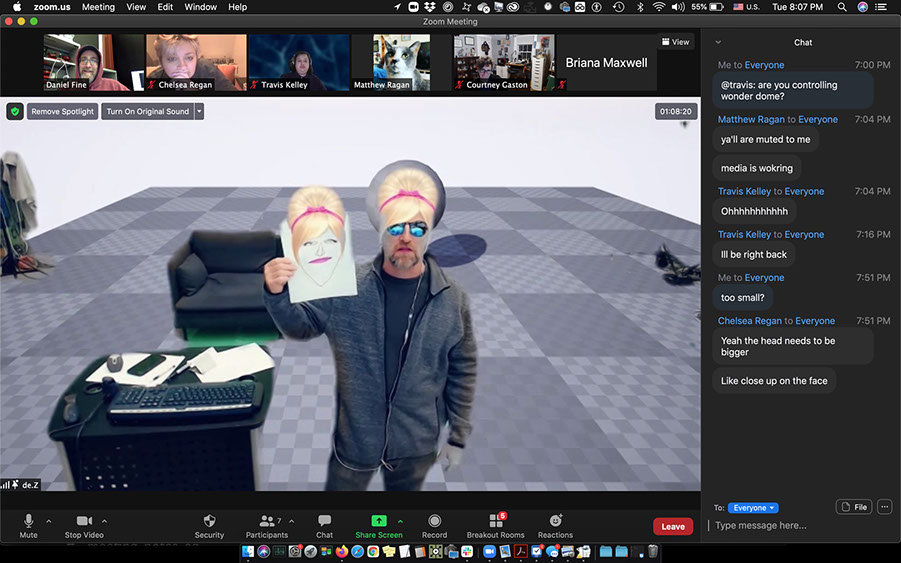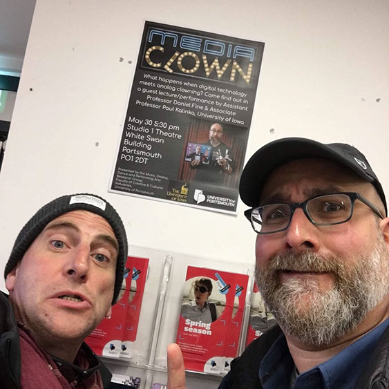 Media Clown (think Keaton, not Bozo) is an ongoing, devised research project that includes live, digital, and hybrid in-person performances. This interdisciplinary research team has members from theatre, art, engineering, and computer science, with collaborators from Industry working with UI faculty, staff, current students and alumni. The purpose of the project is to integrate the newest digital technologies, specifically motion capture, Augmented Reality and real-time systems, with traditional/theatrical clown techniques. How does the analog clown remain relevant in the digital age and interact with audiences using digital technologies? What is the nature of the codependency between live, physical performance and live digital media systems? How can clown blur the lines between real and imaginary spaces while holding up a mirror to our advanced technological society?