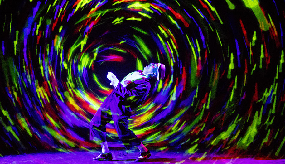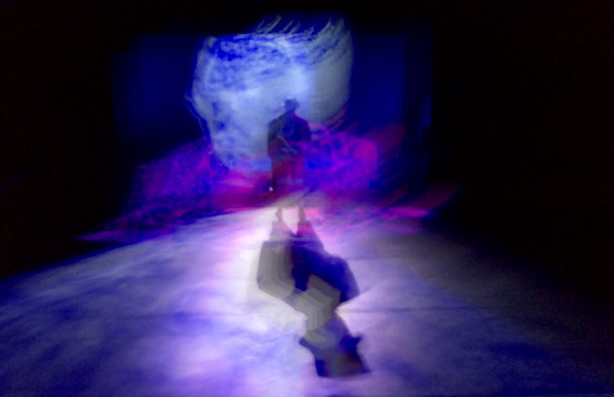 Particles swirl and moving lights auto-match color/intensity of projections. PQ19 Performance. Photo by Dana Keeton