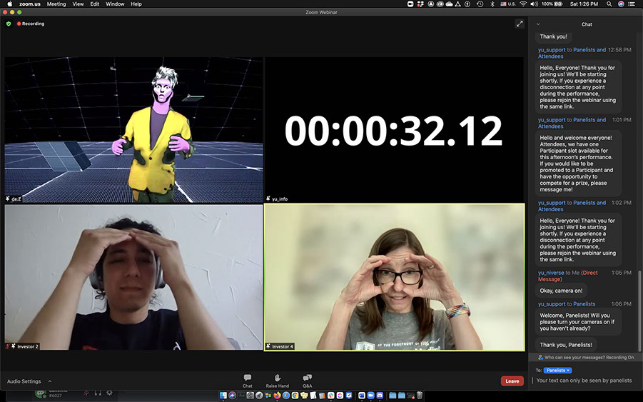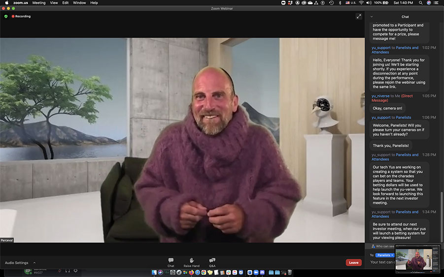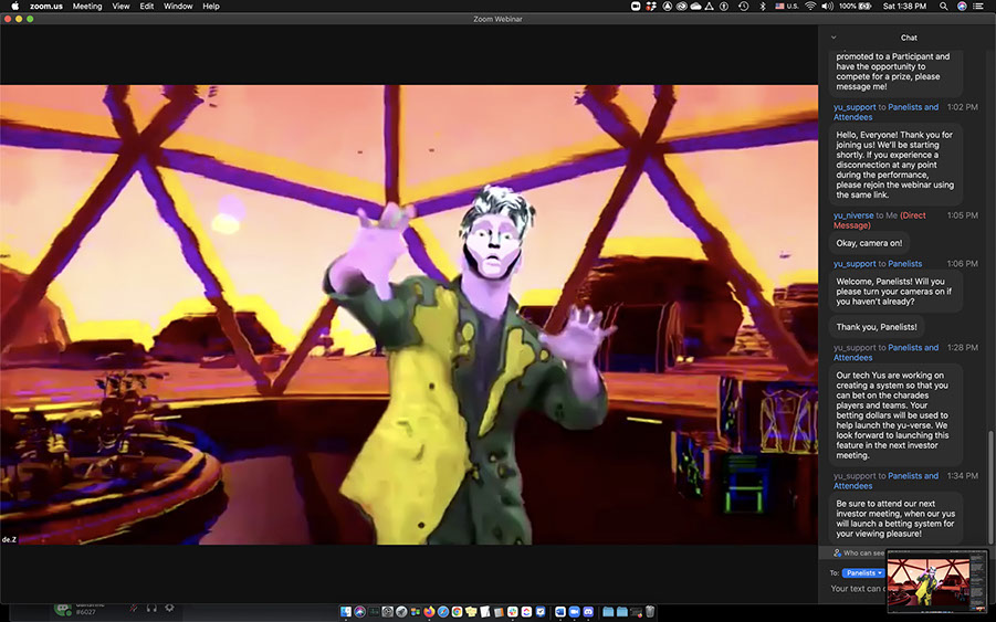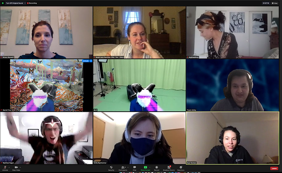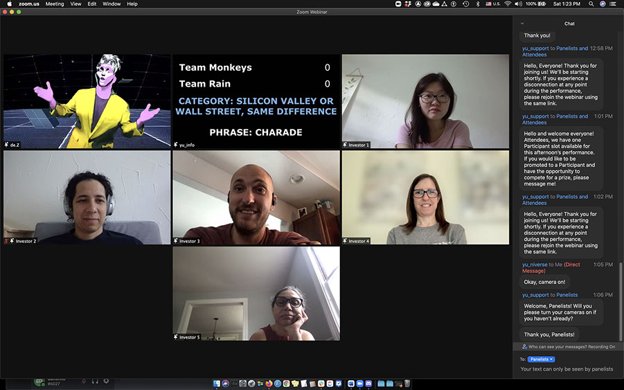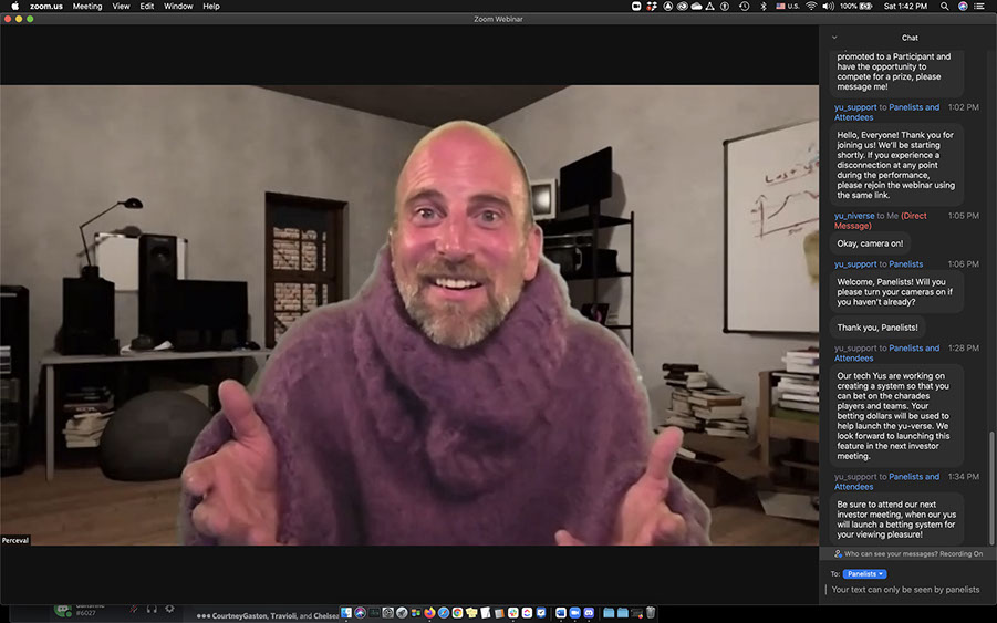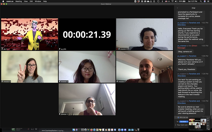 de.Z playing charades with audience members in Zoom. June 2021 virtual/online workshop performance.
