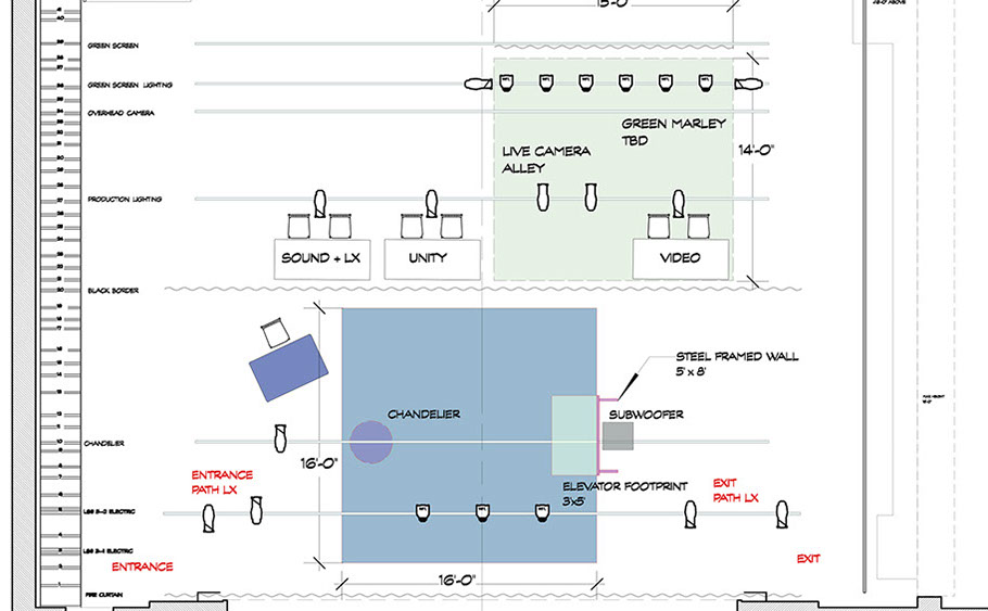 Ground plan of stage for audience experience for Iowa Performance of Elevator #7.