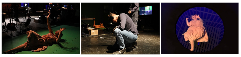 Left: A downlooking video camera captured Casandra. Middle: Player looking down at Casandra. Right: Composited 2D video stream in a hole in the virtual environment from the player’s view. Iowa Performance of Elevator #7.