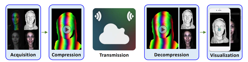 Pipeline for 3D video streaming for distributed VR. The Acquisition Module captures/produces 3D range data/color texture in real-time. Compression Module encodes depth/color data into a standard 2D video codec that is transmitted within a low-latency video stream via WebRTC. On the remote device, the Decompression Module decodes depth and color data to reproduce the 3D range data. Finally, the Visualization Module allows the received 3D video data to be displayed and interacted with in real-time.