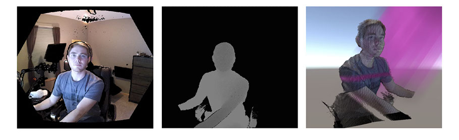 Example data frame captured from the Microsoft Azure Kinect (DK). Left: Color texture image; Middle: Depth map with distance-based threshold applied; Right: Colored 3D reconstruction of the depth map with a point-based “hologram” special effect applied in the rendering.