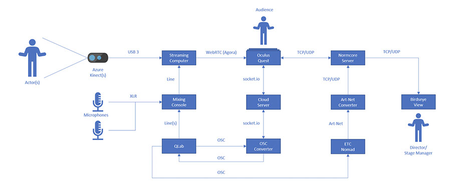 In addition, the research integrates live-event technology, used in professional theatrical productions, to interactively control lighting, sound, and video in virtual reality software and technology. This empowers VR designers to create rich, dynamic environments in which lighting, sound, and video cues can be quickly and easily finetuned during the design process, and then interactively adjusted during performances. By targeting commodity-level VR devices, theatrical productions would be available to those who live in remote locations or are place-bound; to those with restricted mobility; and to those who may be socially isolated for health and safety reasons. More broadly, this research explores ways to advance remote communication and natural interaction through the use of live 3D video within shared virtual spaces (i.e., telepresence). Such advances have potential for great impact on distance training and education, distributed therapy, and tele-medicine; areas whose needs have been accelerated by the current pandemic.