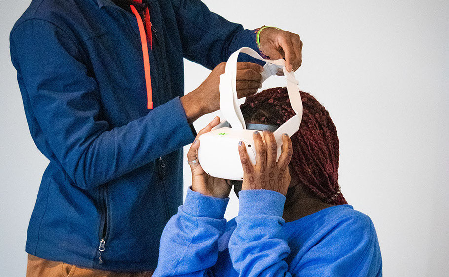 Student team member helps audience put on HMD.